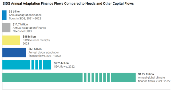 International adaptation finance flows to SIDS are only 0.2% of global climate finance and must grow six-fold to meet assessed needs. Our recent research highlights that the US$12 billion in annual finance need is very large for SIDS economies but represents only 1.2% of all global climate finance and 4% of all global Overseas Development Assistance (ODA).